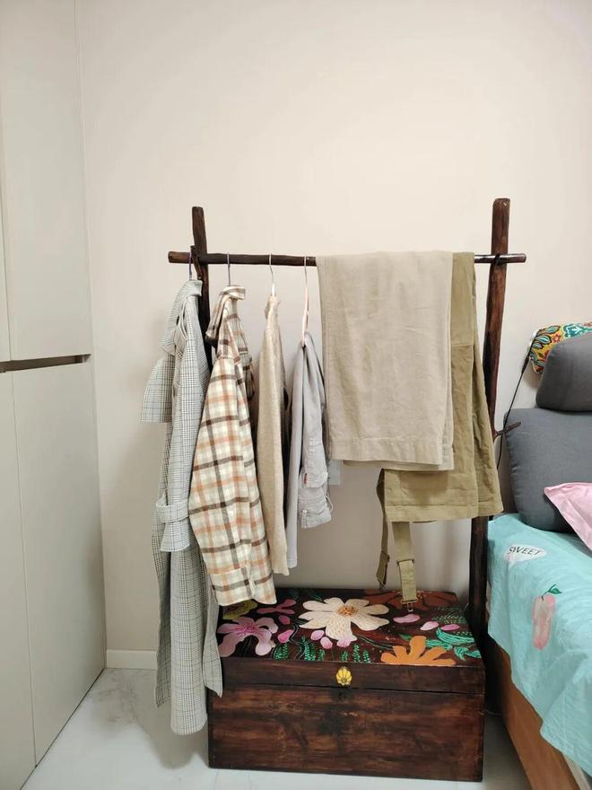 3)给箱盖包一块旧布,再去捡三根木头装上去,就是一个中古风的衣帽架,放在床头旁边,还能代替床头柜。