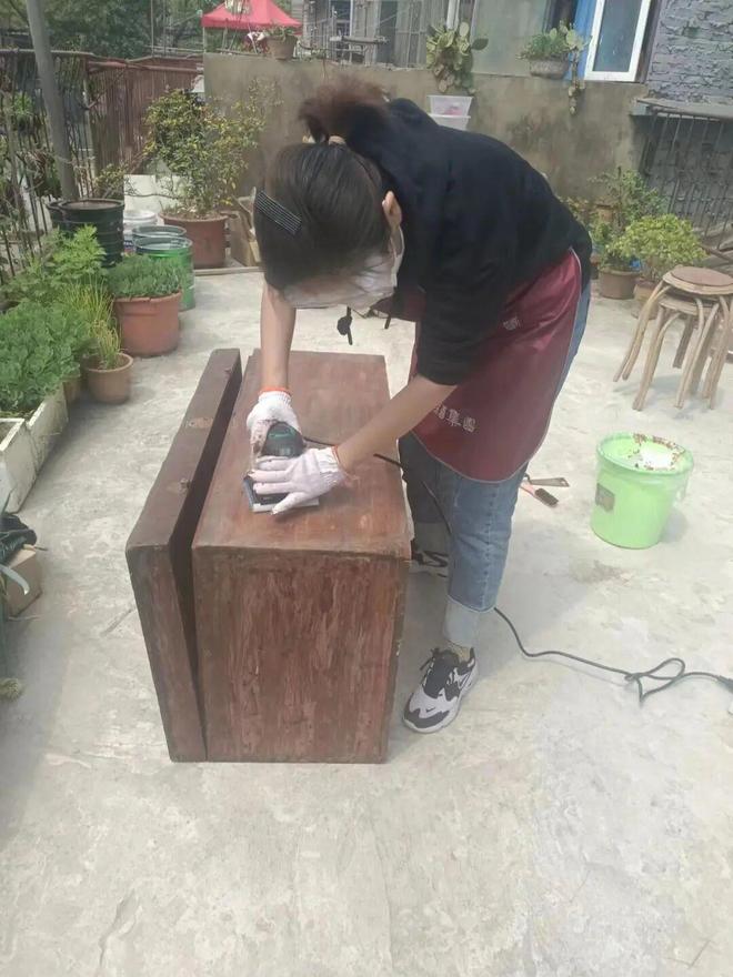 主要难度就是打磨,建议去借一个打磨机或者买个二手的,然后刷木蜡油以及重新更换铜片装饰即可。
