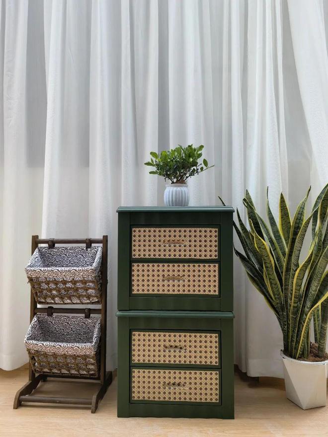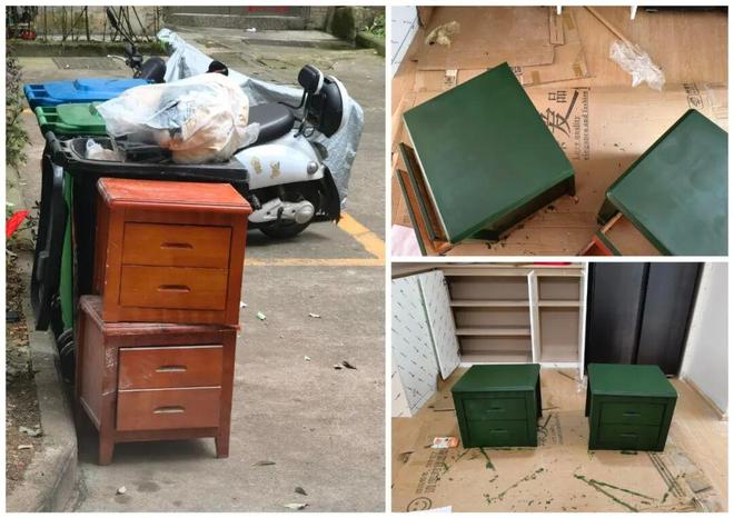 再比如网友@蜜豆随手捡的两个床头柜,拿回家后直接锯腿、滚漆,再贴上藤编贴纸,立马就复古高级多了。