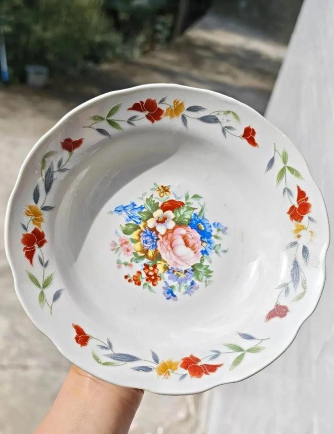 再比如这只40多年前的牡丹花盘子,看着大红大绿,可那种饱满、热烈、真实的生活气息,反而比那种网红餐具更有故事感。