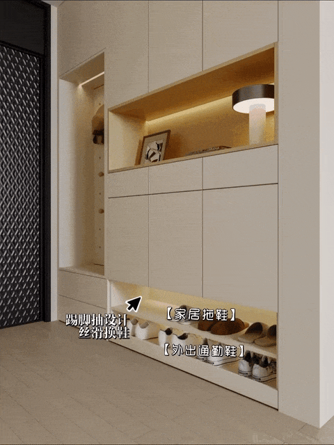 如果还想更有设计感一下,最下面可以设计成抽屉式的放鞋区,也只有这样才能真正实现拿取方便,还能让玄关位置保持干净、整洁。