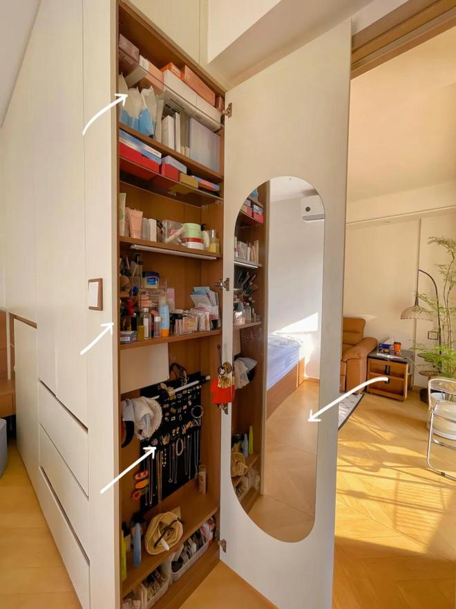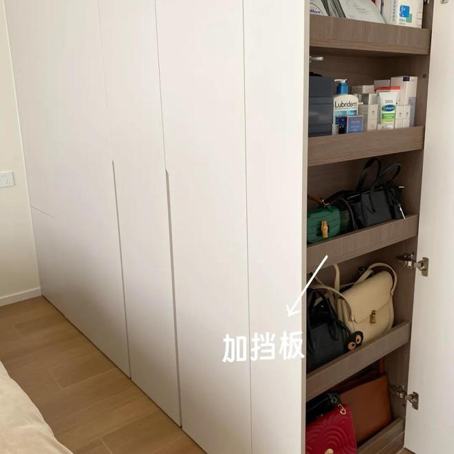 这时,只需要占用卧室衣柜20cm,做出一个超薄化妆侧柜,就可以用来专门囤护肤品,也可以放包包,难道不香吗?