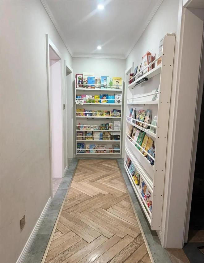 要知道将书柜放在走廊比客厅要好很多,因为客厅来来回回的人多,很容易分散孩子的注意力,而放在走廊,白天一般都不会去“静区”空间。