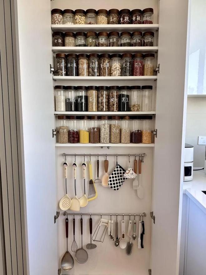 像这样10-25cm的狭窄空间薄柜,可收纳瓶罐、干货、厨房工具等,不占过道空间,却极大提升厨房收纳容量。