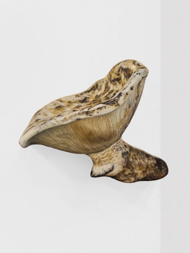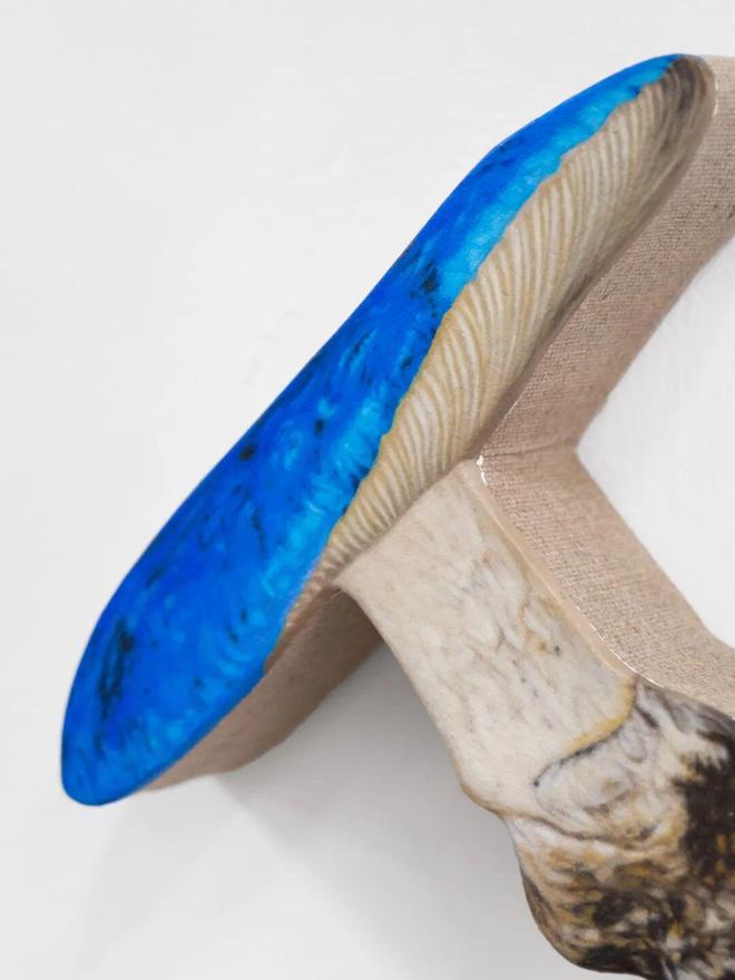 李岳九:由桉画廊呈现的马里斯·施泰格尔的蘑菇系列作品打动了我。它并非普通平面绘画,菌盖的斑驳与菌褶的肌理都带着鲜活气息,带有厚度与体量,仿佛从墙面自然生长出来的微型装置。这幅观看时需调整角度的“画”,让空间本身也参与了作品表达,温润的大地色调与墙面自然融合,点缀的蓝色如建筑中的节点,轻轻打破平淡又不破坏整体氛围。