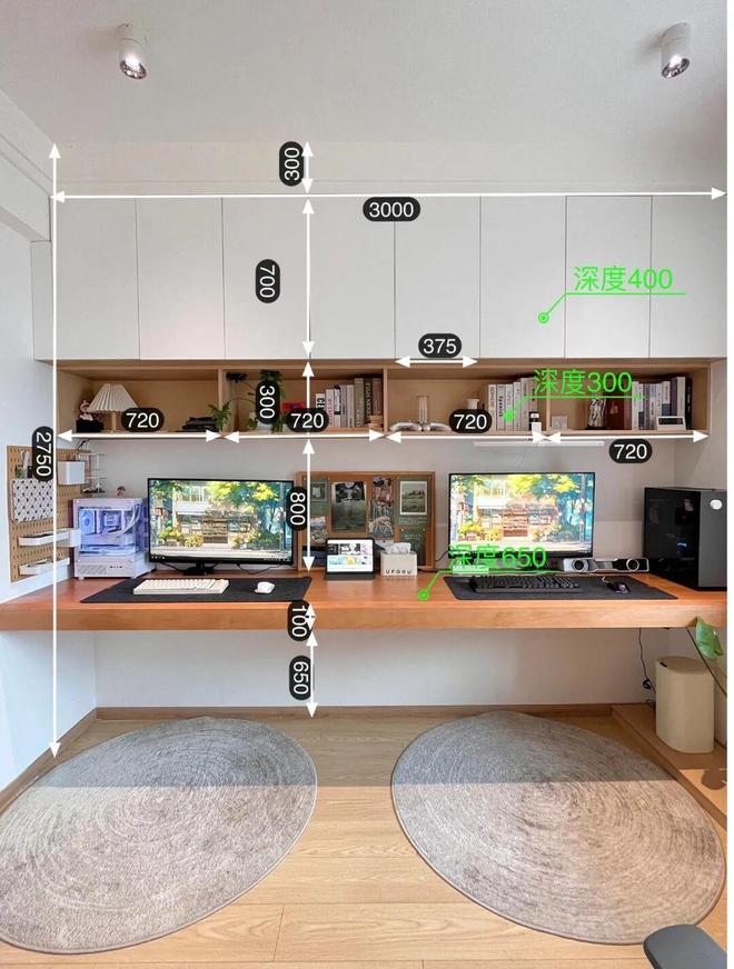 Tips:书桌最好不要加抽屉,或者做一层极窄抽屉(10cm以内),让腿部保持65cm以上的空间。
