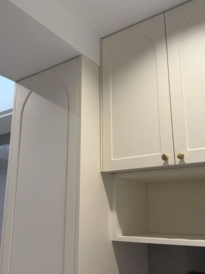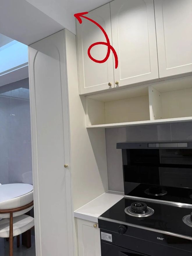 原本厨房高柜是要做到顶的,正好可以与吊柜齐平;结果设计师硬是在厨房门洞上加了个吊顶,然后就变成一高一低,怎么看怎么别扭。