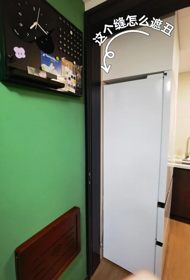 最关键的是,冰箱侧面与吊柜之间也出现了缝隙,现在头都大了,难道设计师就没遇到过这个问题吗?
