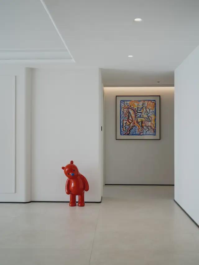 业主对洁净有非常明确的要求,因此在入户动线上,设计师把空间划分为多个层级,而不是简单的换鞋区。