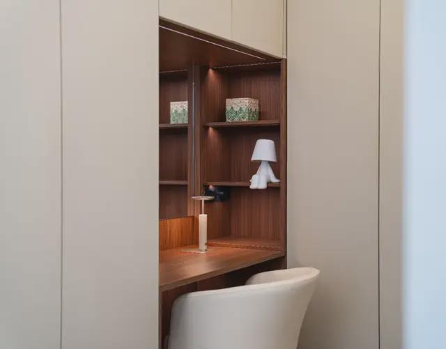 设计师将这些收纳整合进墙体与柜体系统之中,在视觉上保持克制,但在使用上高度完整。