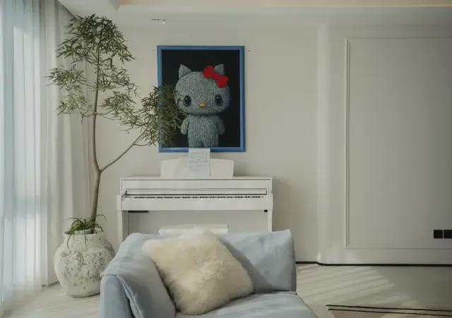 沙发、钢琴、艺术画作,被放置在同一空间中,但没有被明确划分边界。空间更像一个连续展开的生活场域,而不是一个个被命名的功能区域。