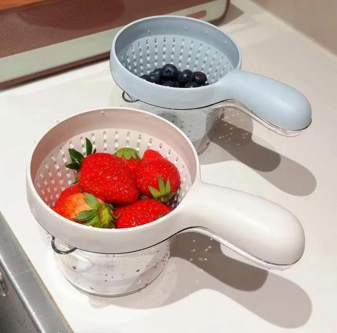 双层撞色设计,颜值高到犯规,放在厨房像个小装饰。关键是有个手柄,单手就能拎着走,给宝宝洗草莓、给自己洗蓝莓,沥完水直接端上桌。