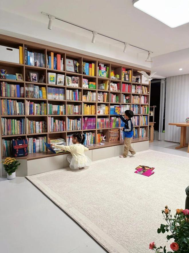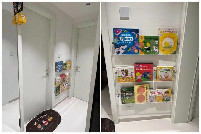 不只是尽头墙面,过道侧面墙同样可以安装绘本架,孩子路过随手抽一本,坐在地上就能看,实用又有趣。