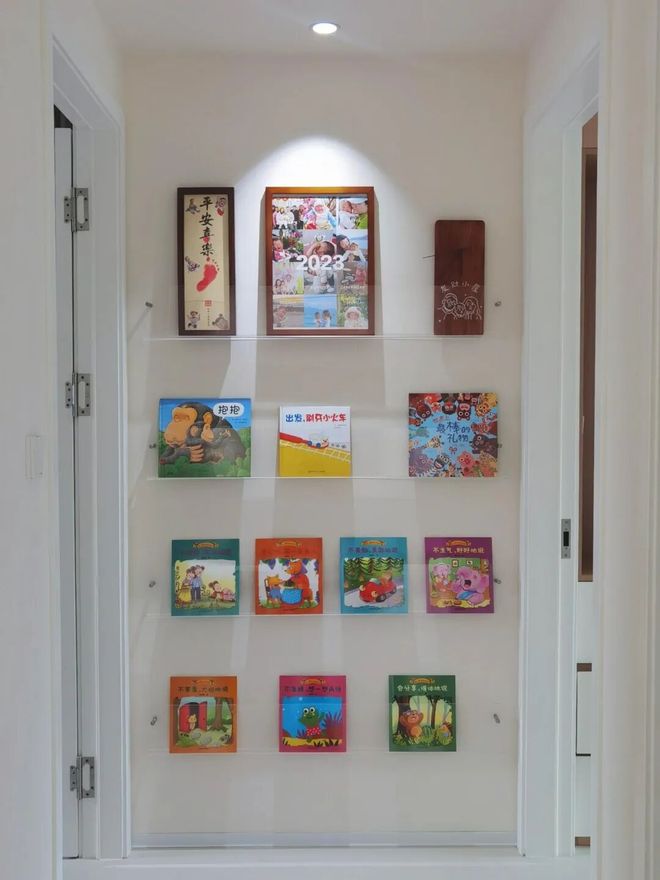 解决方法:可以直接在过道尽头安装几个亚克力绘本架,照片、杂志、绘本、相框,想放什么就放什么,既美观,又不占空间。