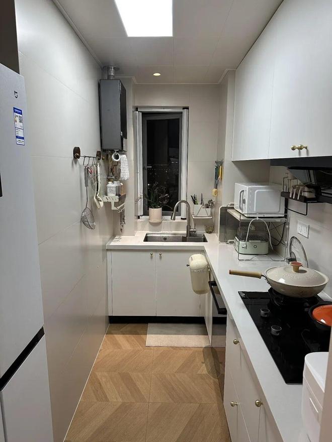 狭长型厨房最尴尬的地方,就是橱柜只能做L型结构,导致台面操作空间严重不足,日常使用十分憋屈。