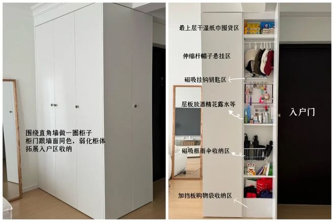 入户门另一侧围绕直角墙设计一组转角柜,正面做薄柜处理,深度15—20cm,专门收纳雨伞、酒精、钥匙、帽子等常用物品。