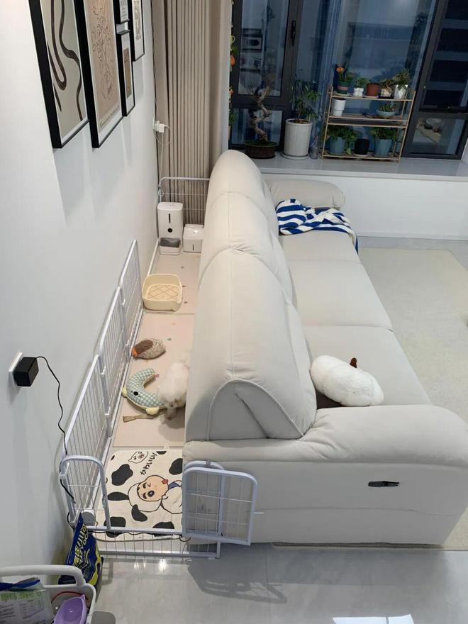 2)把客厅的沙发往外挪一点,再弄个围栏一挡,就变成宠物专属的“跑道房”了,比圈一块空间宽敞多了,而且不占空间。
