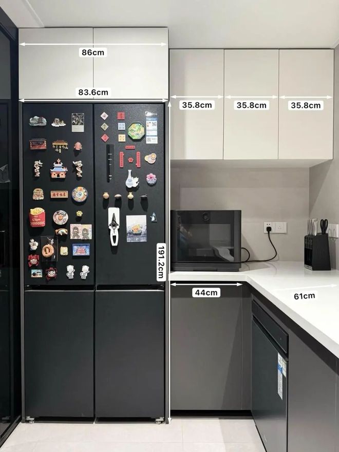 为了扩充收纳力,不少人都会将柜子设计到顶。比如厨房里的吊柜、卫生间镜柜、以及冰箱上面的柜子等。