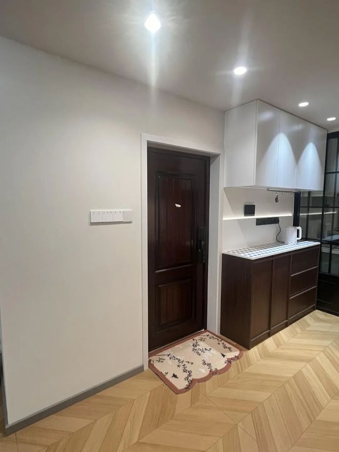 一字型玄关最头疼的问题,就是没有理想的鞋柜位置,导致收纳空间严重不足,而且设计不好特别显堵。