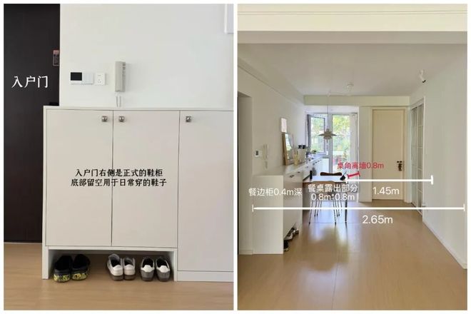 解决思路:入户门一侧设计一组半高鞋柜,专门收纳日常穿的鞋子。当然,也可以和餐边柜连成一体,就如下图中那样。