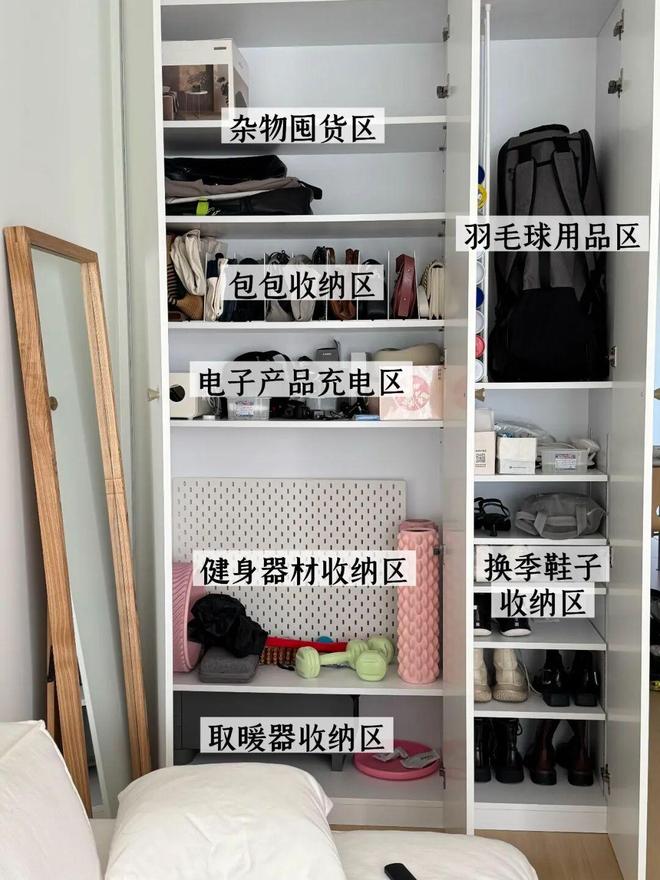 侧面柜体深度正常做,专门收纳换季鞋子以及一些杂物。一正一侧,薄厚结合,既解决了收纳难题,又不显堵。