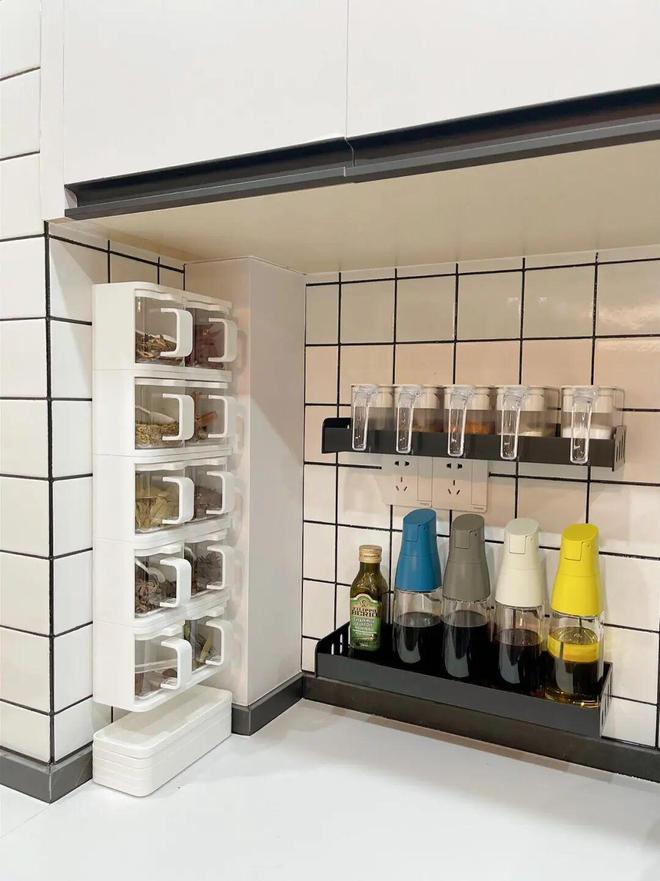 厨房算是收纳重灾区了,几乎每个家庭都或多或少买过一些收纳工具。比如调料罐、分装瓶,总想着整齐划一才好看。