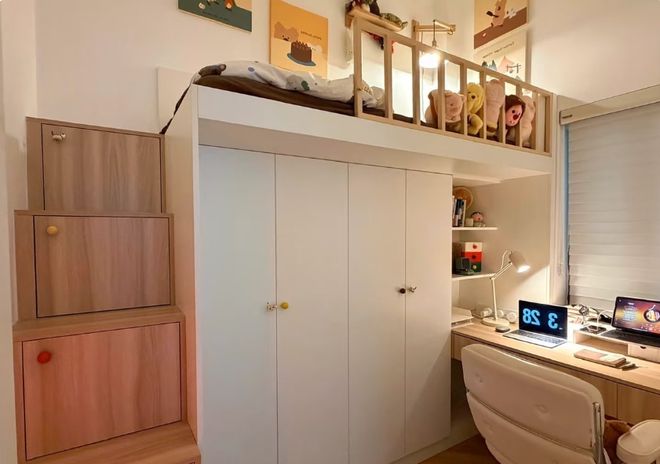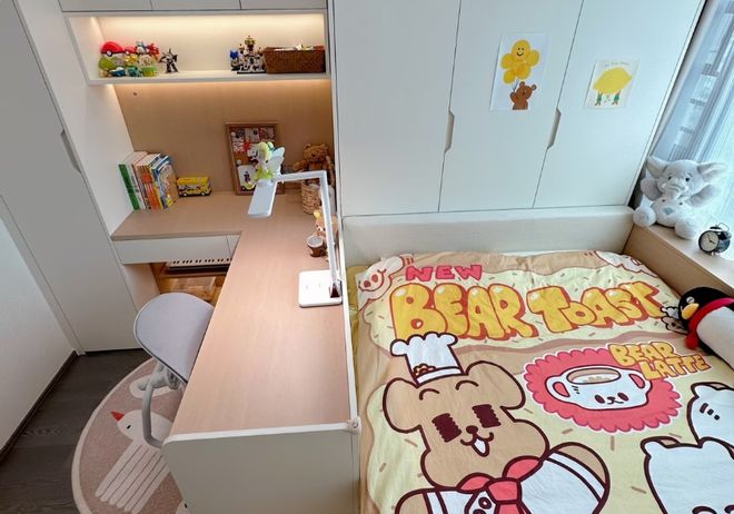 把小次卧改成成长型的儿童房,可以让孩子从幼儿期到青春期,都能适应身高需求审美的变化。