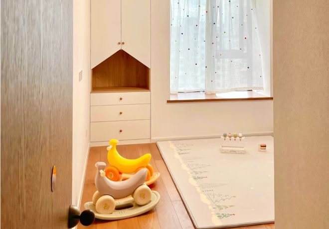 而这种灵活的布局看似很简单,实则是很有远见的。年龄小的时候,地面空间留大,可以铺爬行垫搭积木;上学以后可以增加书柜学习区;到青春期还可以自行调整软装房间,一直贴合孩子的成长节奏。