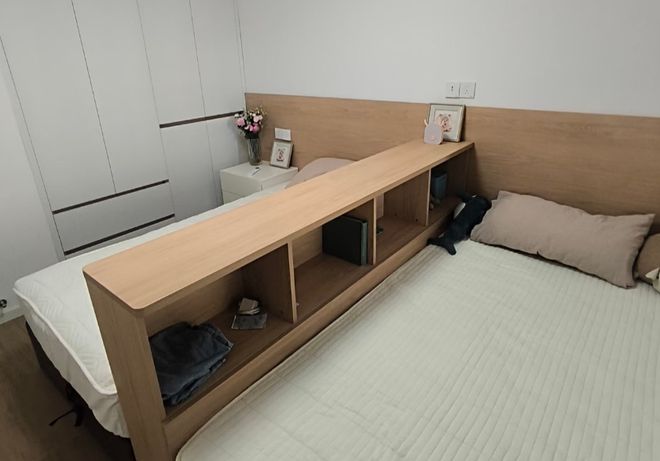 整面墙收纳容量是非常惊人的,像换季的衣物,被褥,儿童玩具都能藏起来,地面能保持清爽,房间反而比放两张床更显大