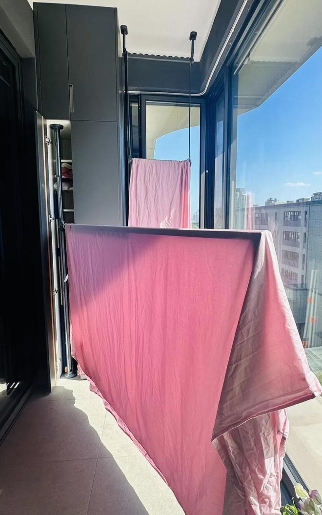 因为在阳台上还可以加装隐形晾衣杆,有了它,再也不用担心床单被套没地方晾晒了。