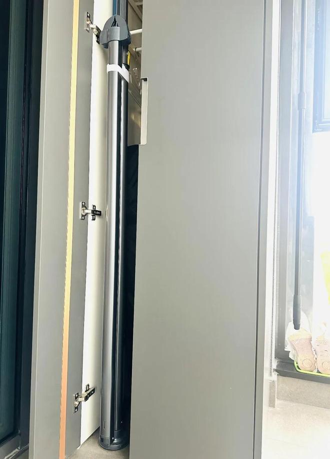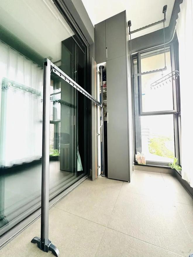 有人说,家里晾晒衣服最好的位置就是客厅阳台,但又不想装传统的升降晾衣架,同时阳台两侧又做了柜子,没办法做侧装晾衣架。