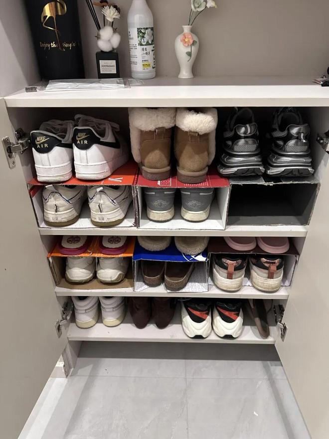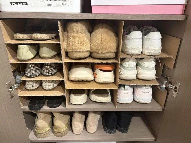 另外,你还可以把鞋柜里的活动层板拆了,重新用纸箱+热熔胶自制个多层鞋架,满足不同鞋子收纳。