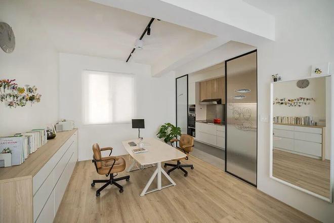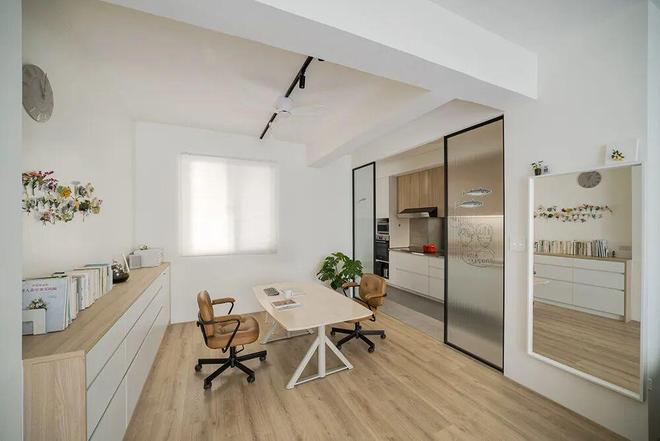 设计师将原本的小房间整合至餐厅区域,并以一张长形大桌作为锚点,把“实用”做到了极致,完美展现“一桌多用”的核心功能——这张桌子不仅是日常家人餐叙、相聚谈心的场所