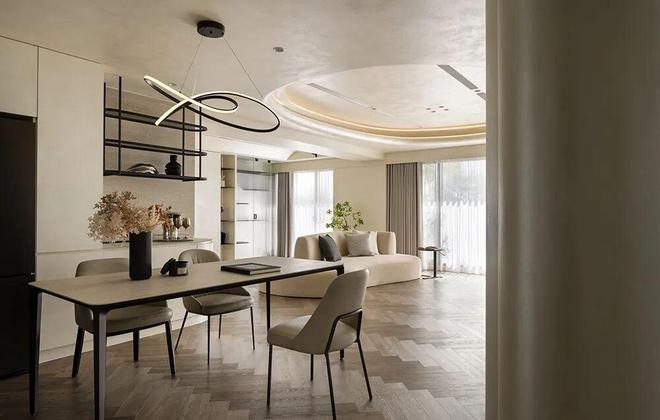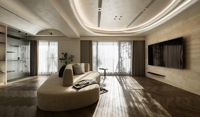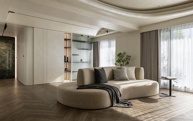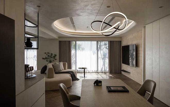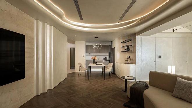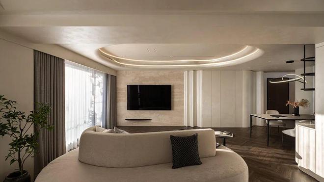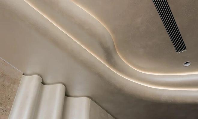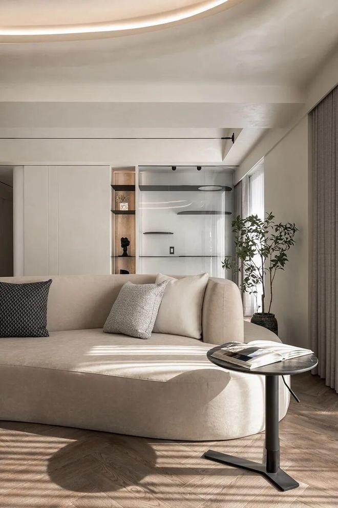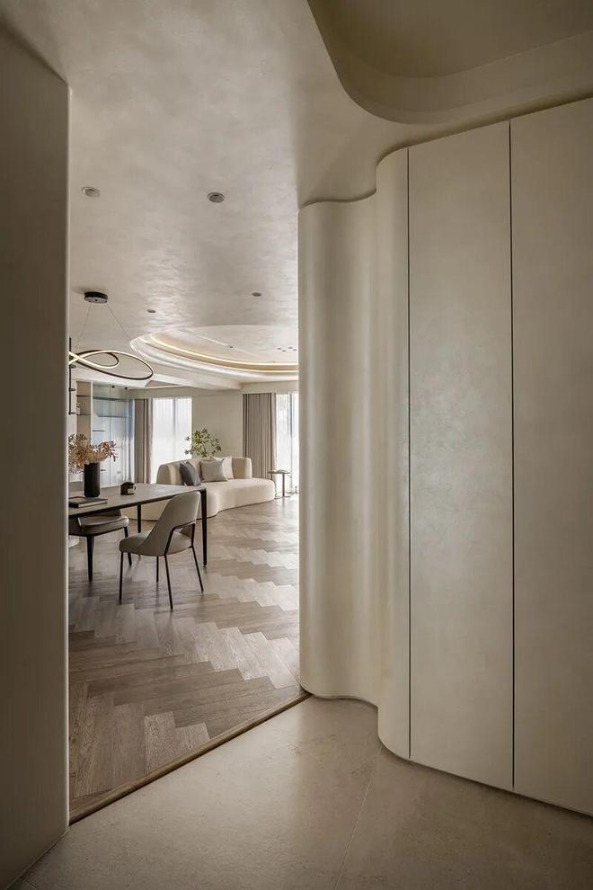 全屋独家调和的御柔色手工涂料,温柔又耐脏,根本不怕娃造!天花板做了湖泊感有机曲线,没有一点尖角,对小孩、猫咪都超安全。挑高户型 + 隐藏式软条灯,光从缝隙里流淌出来,白天看天光,晚上暖灯一开,治愈感直接拉满!