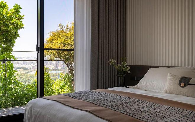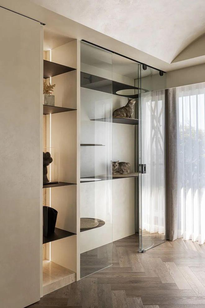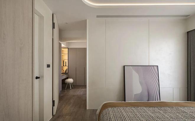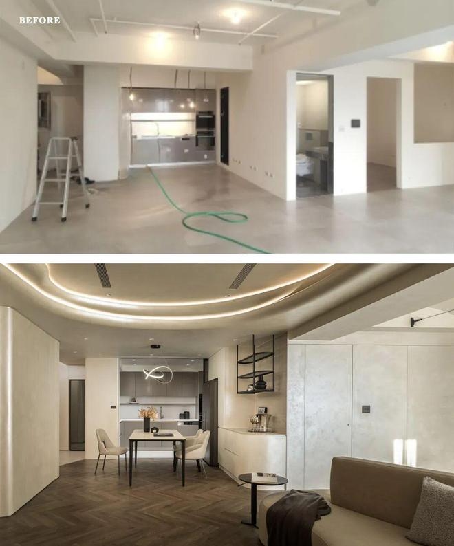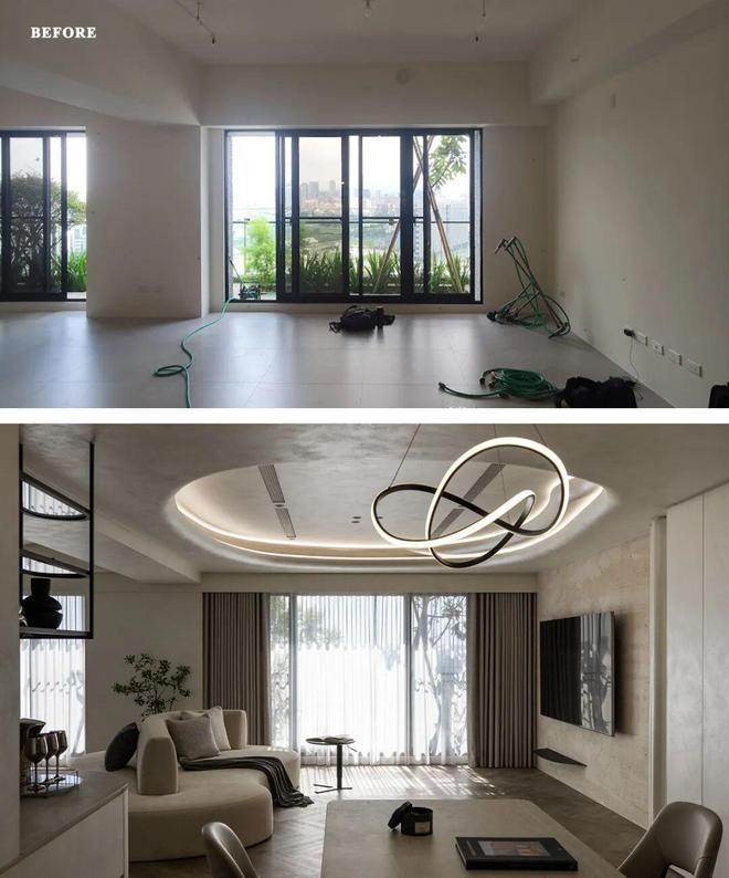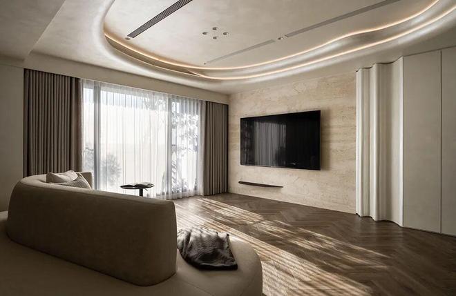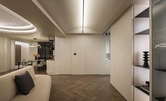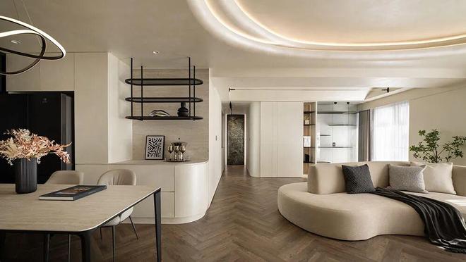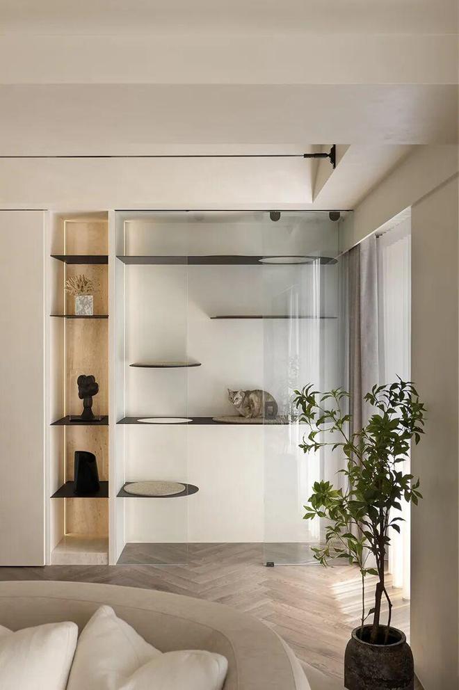 全屋独家调和的御柔色手工涂料,温柔又耐脏,根本不怕娃造!天花板做了湖泊感有机曲线,没有一点尖角,对小孩、猫咪都超安全。挑高户型 + 隐藏式软条灯,光从缝隙里流淌出来,白天看天光,晚上暖灯一开,治愈感直接拉满!
