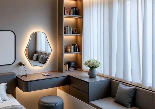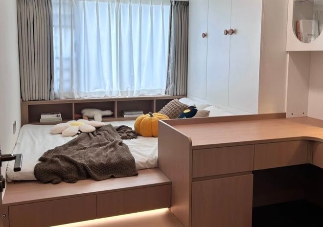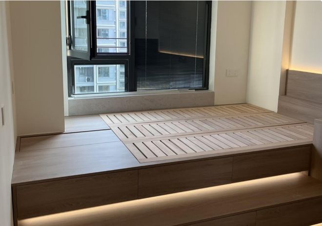 完成以后你会发现,飘窗不再是独立的区域了,而是变成了榻榻米的一部分,整个房间的布局浑然一体,干净又利索。