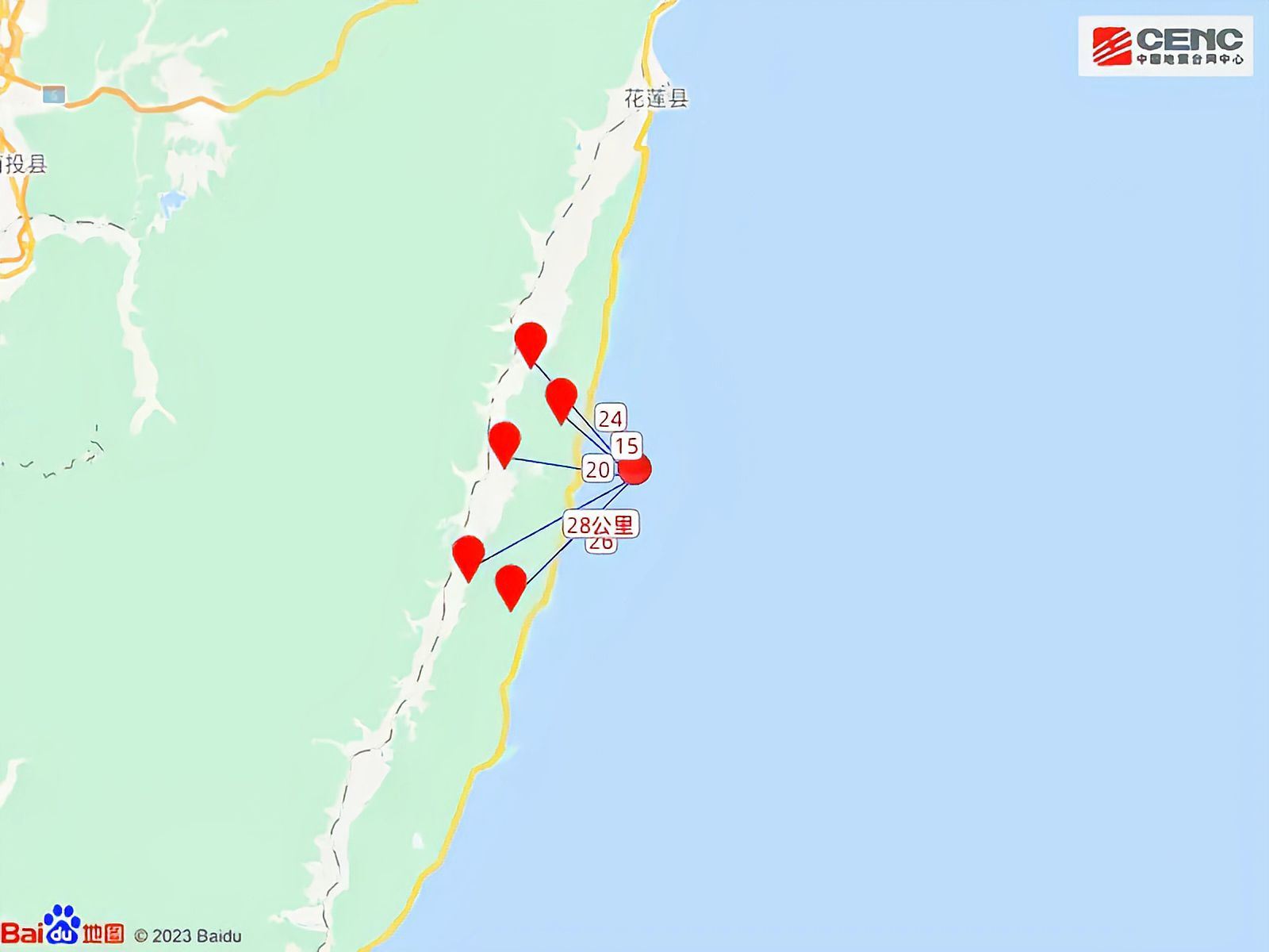 周边县城:震中距丰滨乡15公里、距瑞穗乡20公里、距光复乡24公里、距长滨乡26公里、距玉里镇28公里,距花莲县56公里,距台北市172公里。