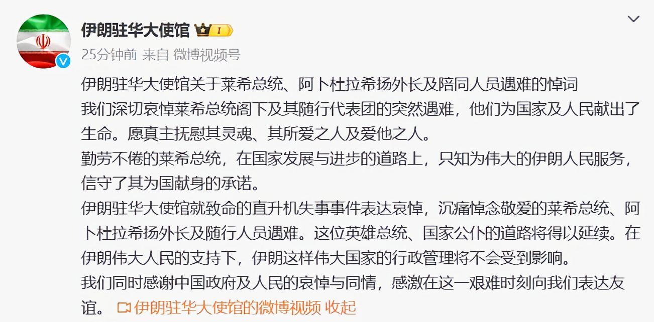 伊朗驻华大使馆就致命的直升机失事事件表达哀悼,沉痛悼念敬爱的莱希总统、阿卜杜拉希扬外长及随行人员遇难。这位英雄总统、国家公仆的道路将得以延续。在伊朗伟大人民的支持下,伊朗这样伟大国家的行政管理将不会受到影响。