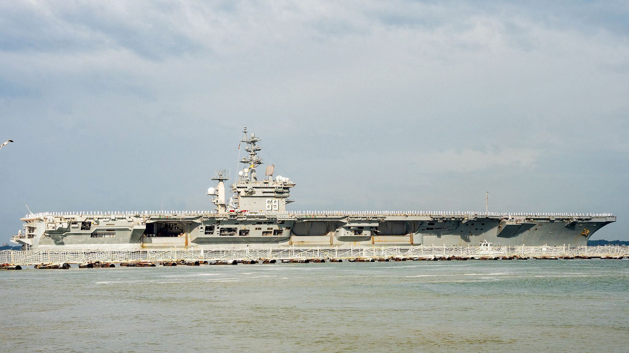 当地时间2023年10月14日,美国诺福克,“艾森豪威尔”号航空母舰准备从诺福克海军基地部署。图片来源:视觉中国(资料图)