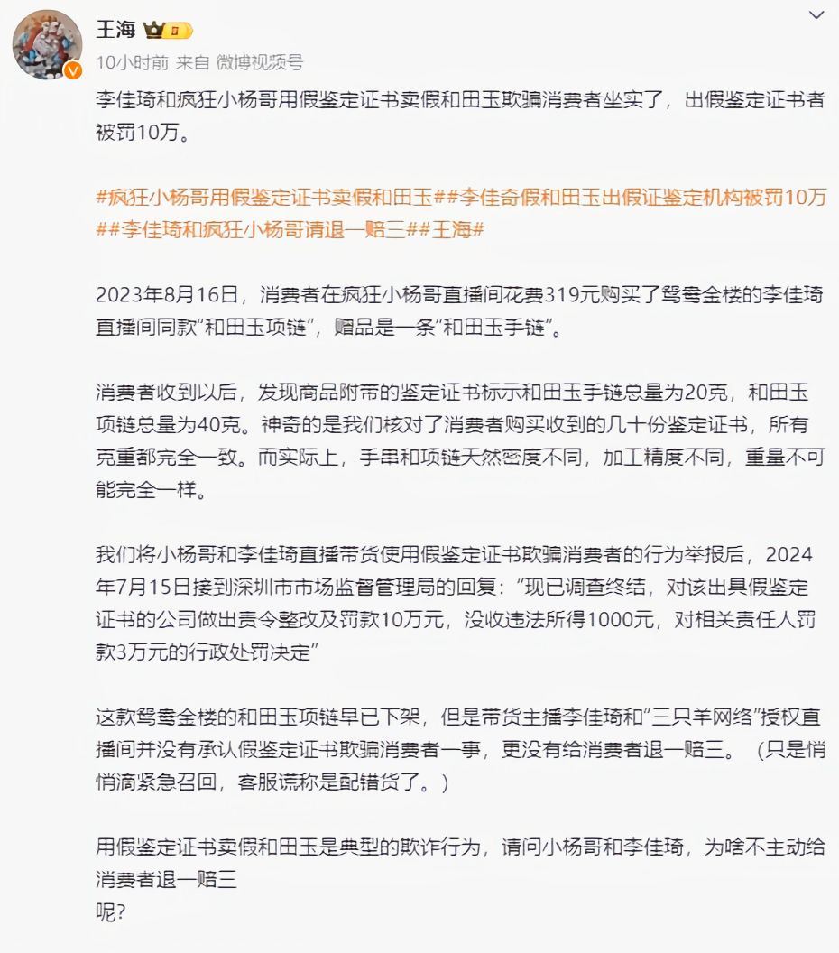 打假人@王海 发文称:李佳琦和疯狂小杨哥用假鉴定证书卖假和田玉欺骗消费者坐实了,出假鉴定证书者被罚10万元。
