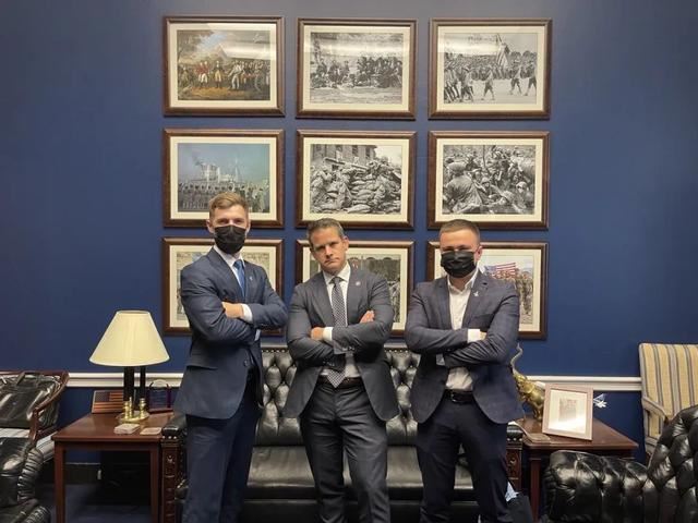 美国众议员亚当·金辛格与乌克兰飞行员“果汁”(左)、梅斯(右)合影