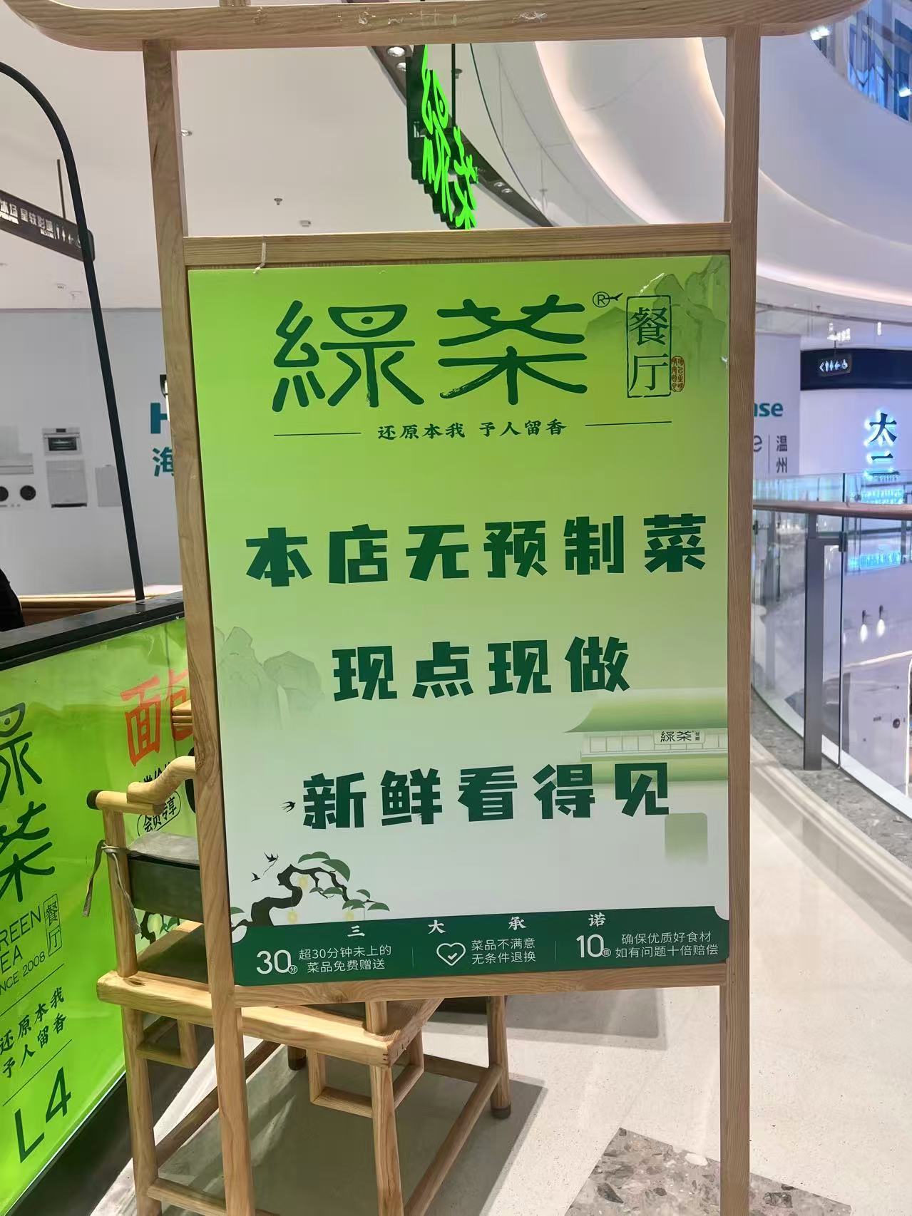 绿茶餐厅门口此前摆放的“无预制菜”招牌
