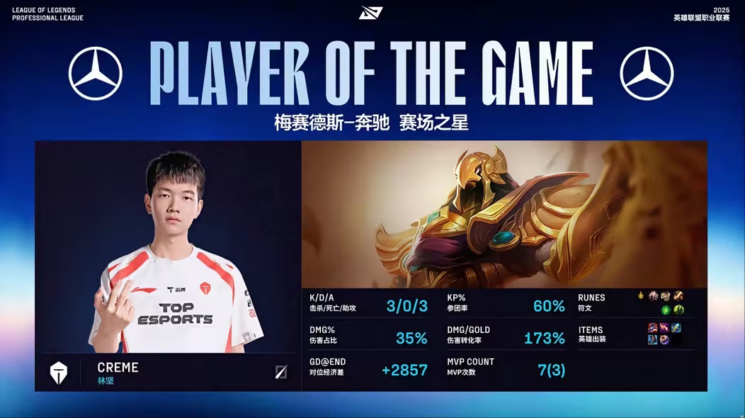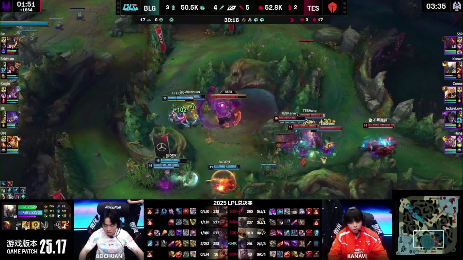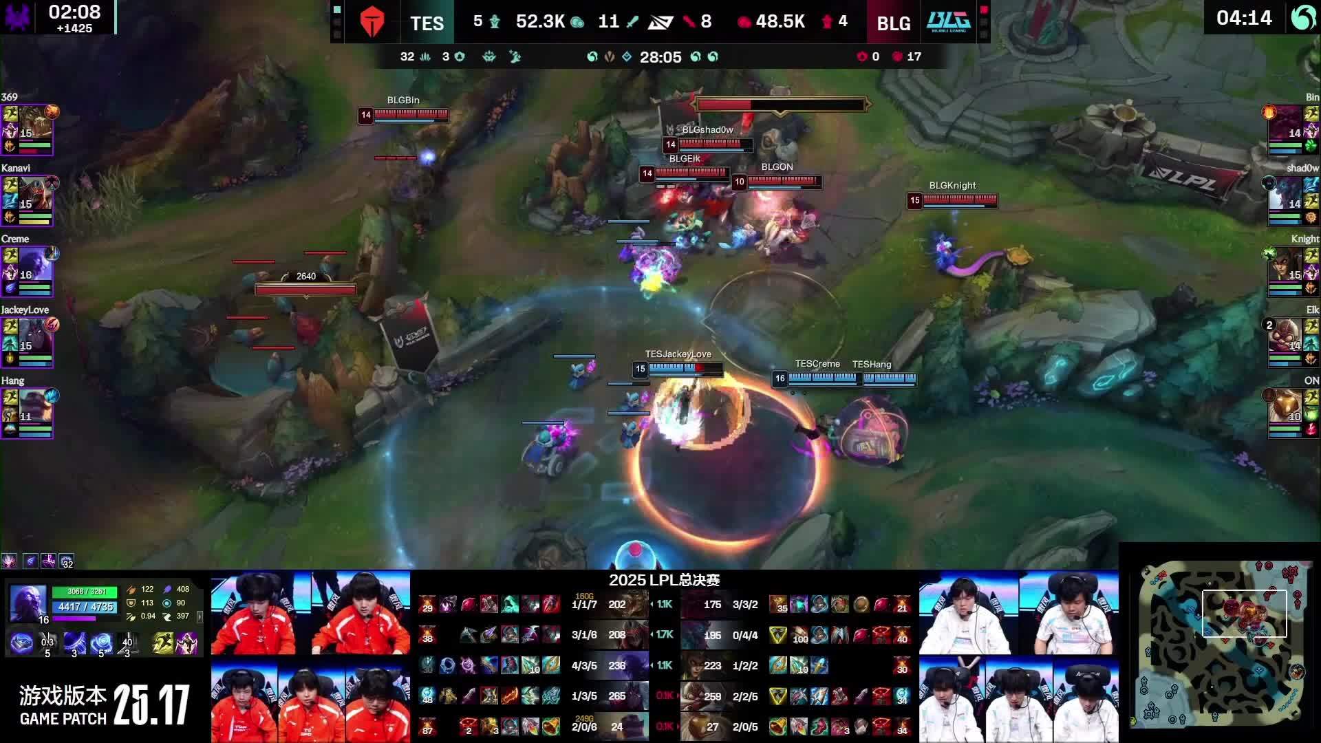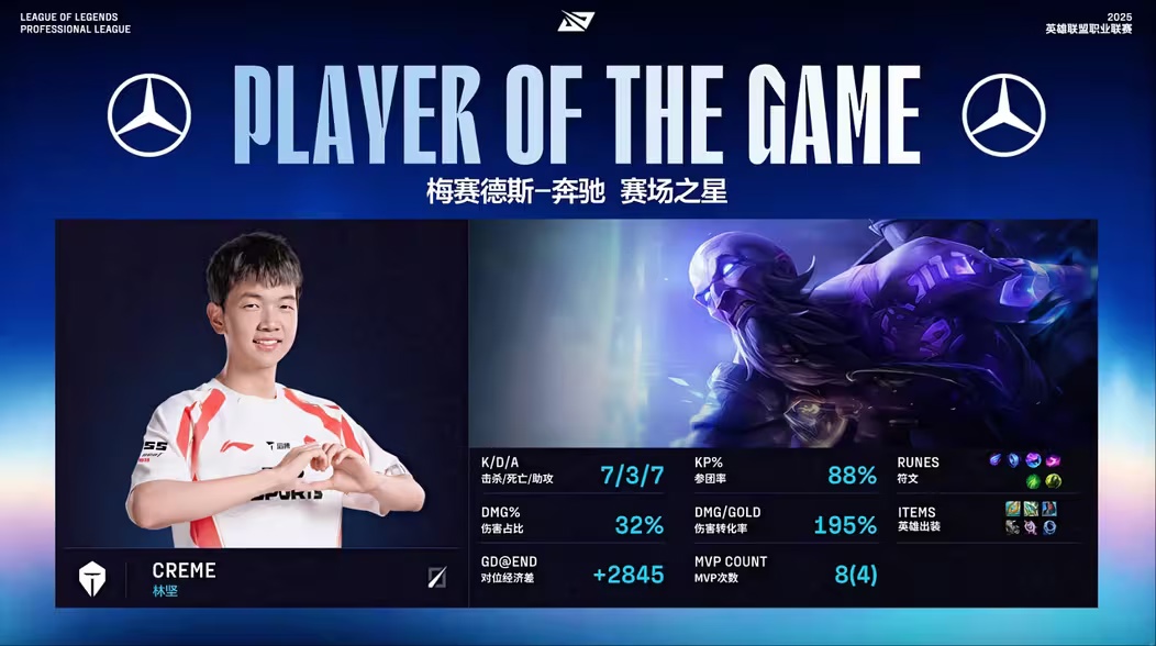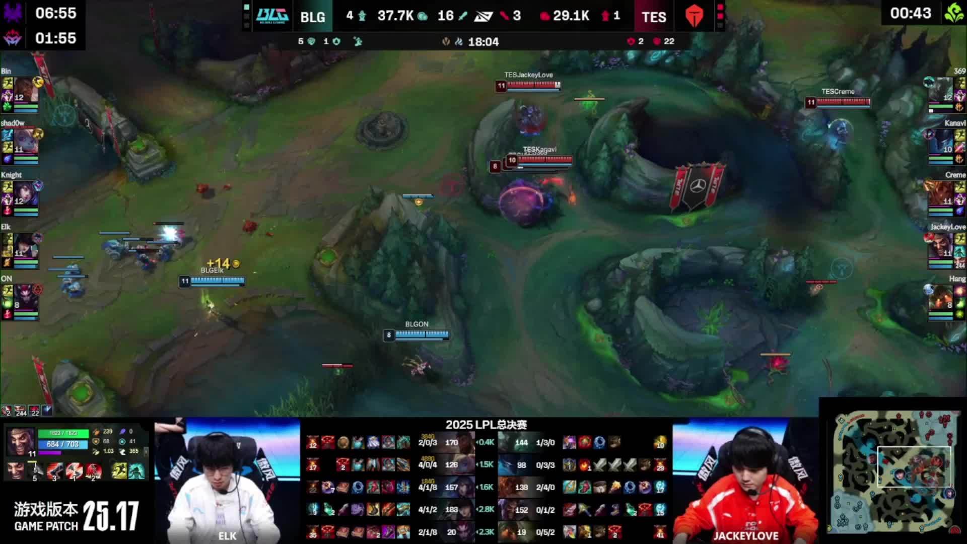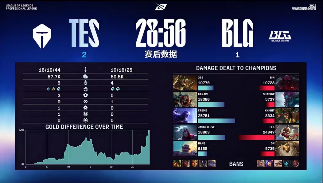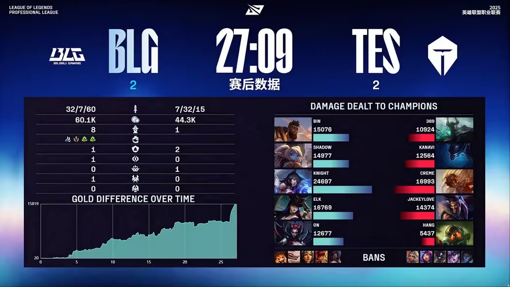 - 39 分钟,野区爆发团战,shad0w 猪妹顶在正面,Elk 烬远距离开大将妮蔻狙至残血,BLG 团战完成一换五,随后一波推平基地,拿下本场比赛的胜利,成为 2025 LPL 年度总冠军!