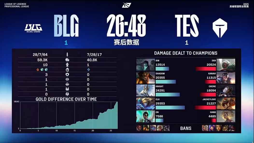 - 26 分钟,BLG 快速拿下大龙,随后接连击杀对手,一波推平基地,再次扳平比分!