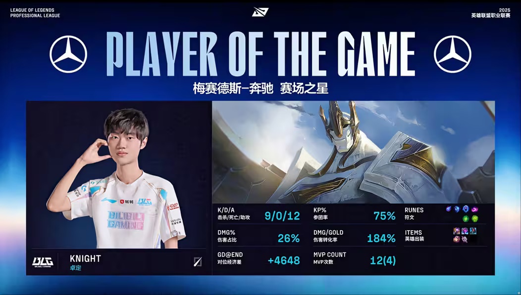 - 24 分钟,shad0w 皇子三进三出丝血逃生,BLG 众人集结后展开追击,Knight 加里奥究极绕后留住三人,最终 BLG 完成零换五。