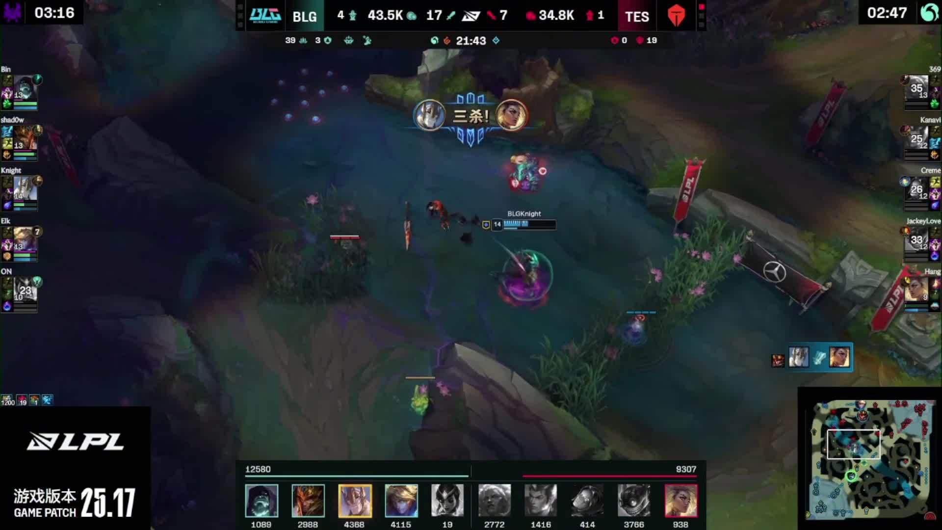 - 19 分钟,BLG 抓死妮蔻,Knight 阿卡丽收获人头。