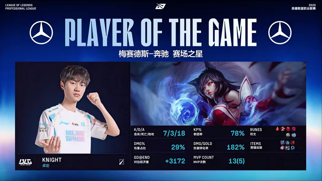- 12 分钟,Knight 加里奥面对集火吸收大量伤害,Elk 伊泽瑞尔精准 Q 技能带走炸弹人,BLG 打出一换三。