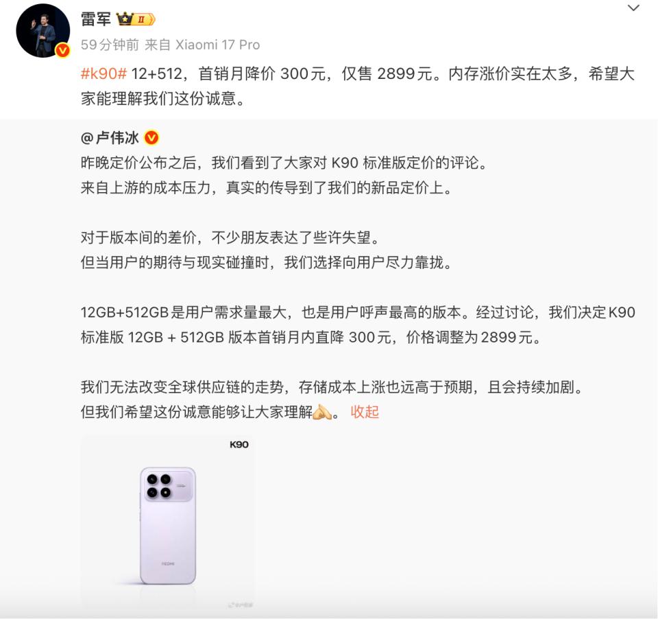 小米集团合伙人卢伟冰发文称,来自上游的成本压力,真实的传导到了新品定价上。12GB+512GB 是用户需求量最大,也是用户呼声最高的版本。经过讨论,决定把 K90 标准版 12GB+512GB 版本首销月内直降 300 元,价格调整为 2899 元。