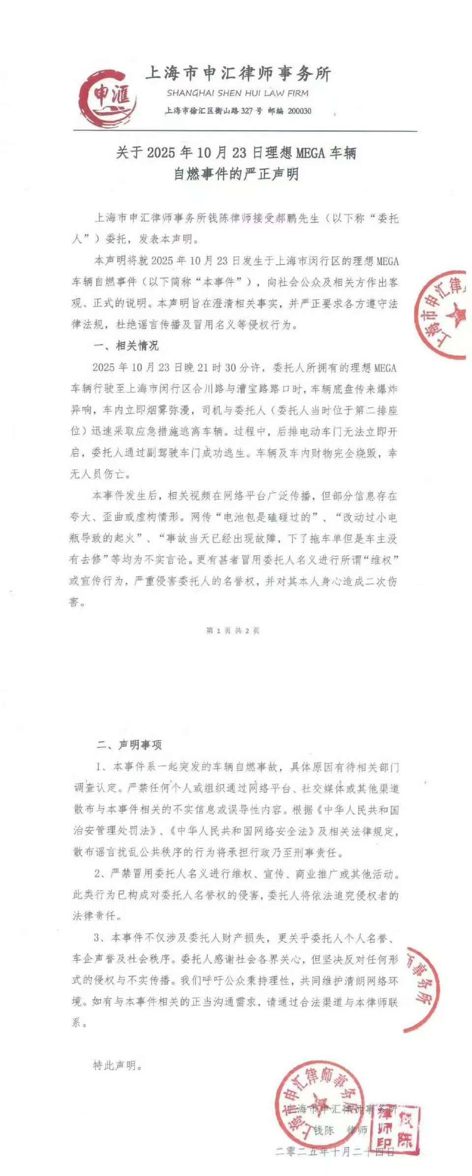 DoNews10月24日消息,针对昨晚一辆理想MEGA在行驶途中突然起火,当事人委托律师严正声明:2025年10月23日晚21时30分许,委托人所拥有的理想MEGA车辆行驶至上海市闵行区合川路与漕宝路路口时,车辆底盘传来爆炸异响,车内立即烟雾弥漫,司机与委托人(委托人当时位于第二排座位)迅速采取应急措施逃离车辆。