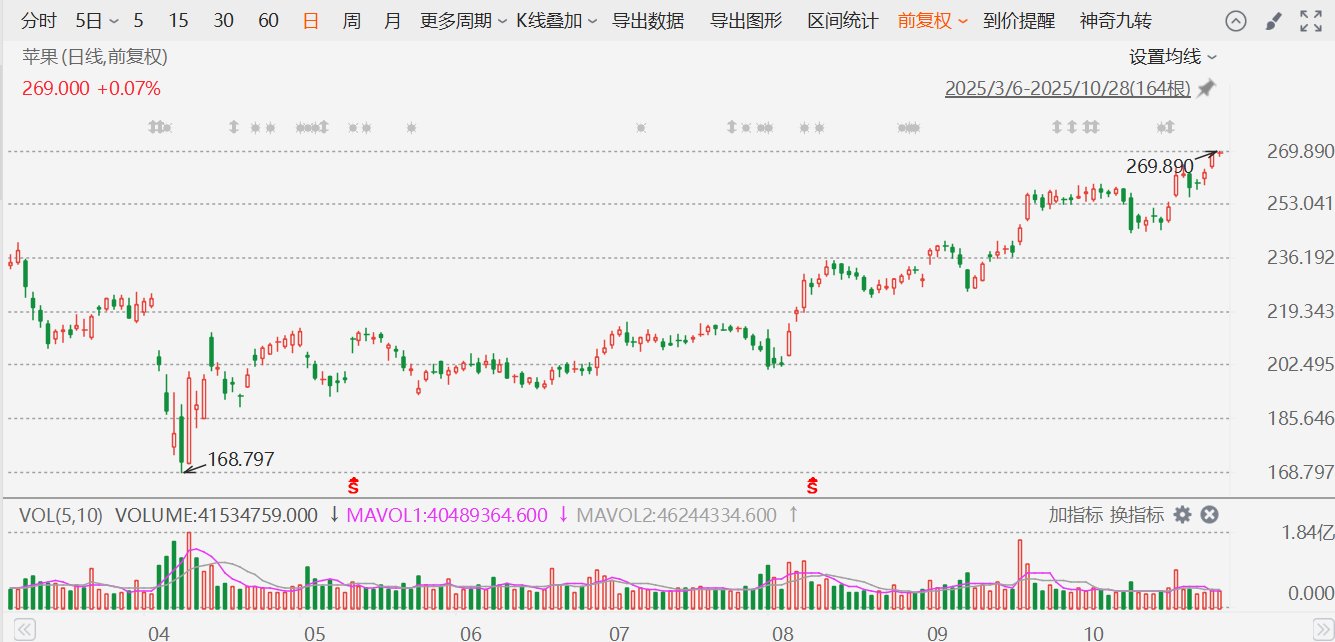 不过,苹果市值4万亿美元的纪录未能维持到收市。苹果收盘仅升0.07%,但仍创新高。自4月低位至今,苹果累涨近60%,市值增加逾1.4万亿美元,主要受惠于关税忧虑纾缓,以及iPhone 17初步销售理想带动。